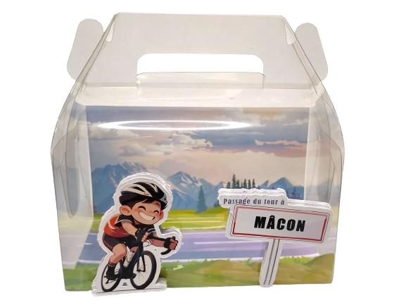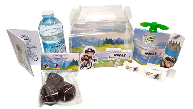 Tous les produits sont personnalisés pour ravir les jeunes fans du Tour. De plus, vous pouvez choisir la ville d'étape pour personnaliser la boîte elle-même !
